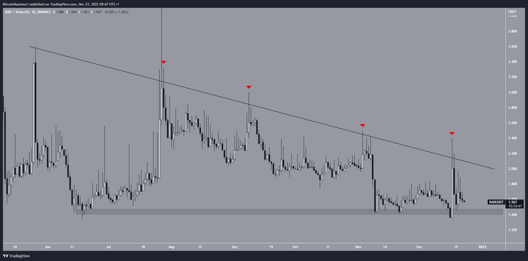 Vị trí thứ 3 trong top 5 Altcoin tăng mạnh nhất tuần là Radicle. Giá RAD đã giảm xuống dưới đường kháng cự giảm dần kể từ ngày 28/5. Cho đến nay, đồng coin đã bị từ chối bởi đường này nhiều lần (biểu tượng màu đỏ), gần đây nhất là vào ngày 17/12.