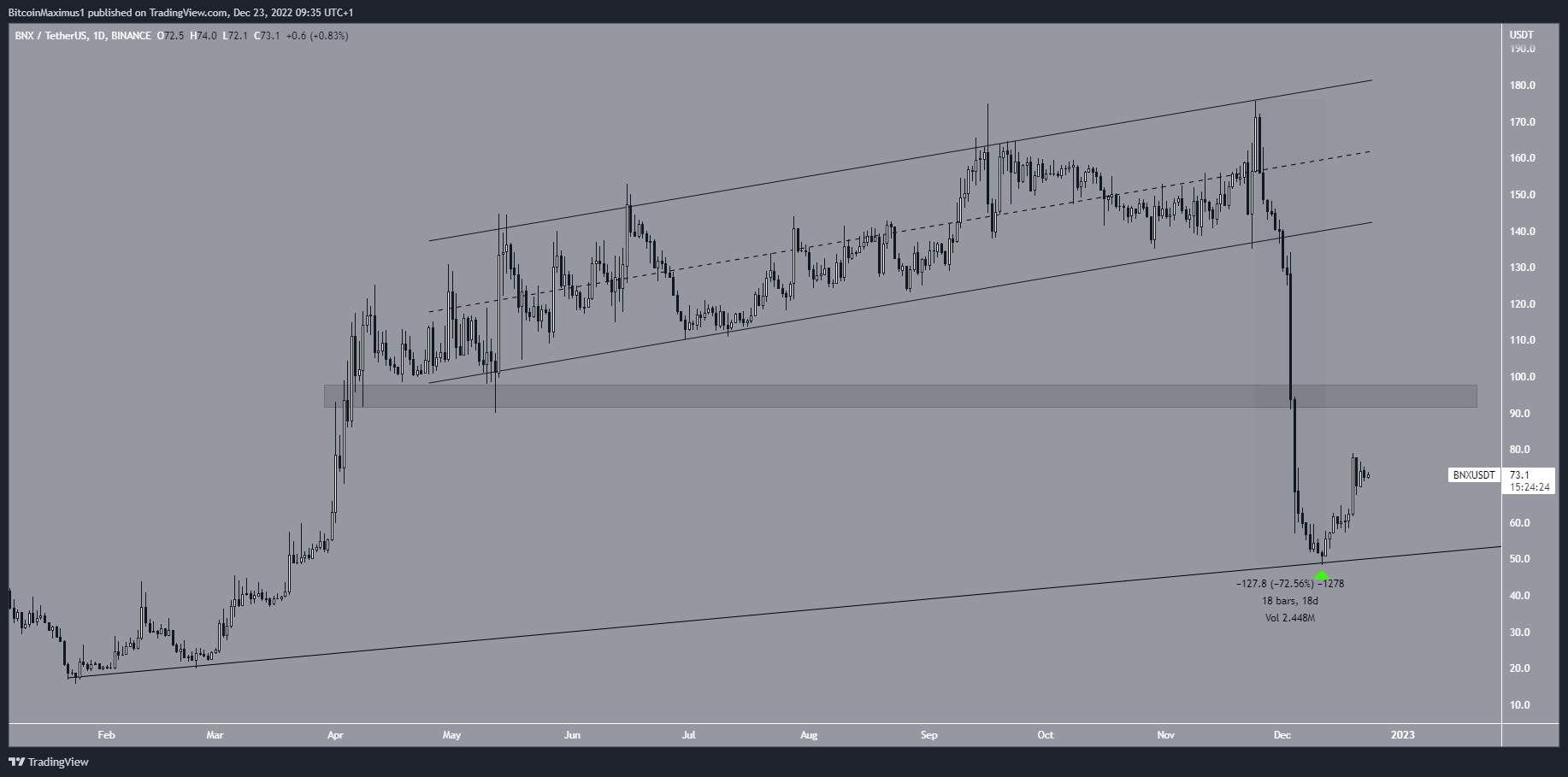 BinaryX là Altcoin tăng mạnh nhất tuần qua. Giá BNX đã giảm kể từ khi đạt mức cao nhất là 175.6 USD vào ngày 24/11. Năm ngày sau, nó đã phá vỡ kênh song song tăng dần và tăng tốc độ giảm. Điều này dẫn đến mức thấp nhất là 48.4 USD vào ngày 11/12, giảm 72% chỉ trong 18 ngày. Tuy nhiên, giá BNX đã tăng trở lại sau đó, xác nhận đường hỗ trợ tăng dần dài hạn (biểu tượng màu xanh lục) đã có từ tháng 1/2022.