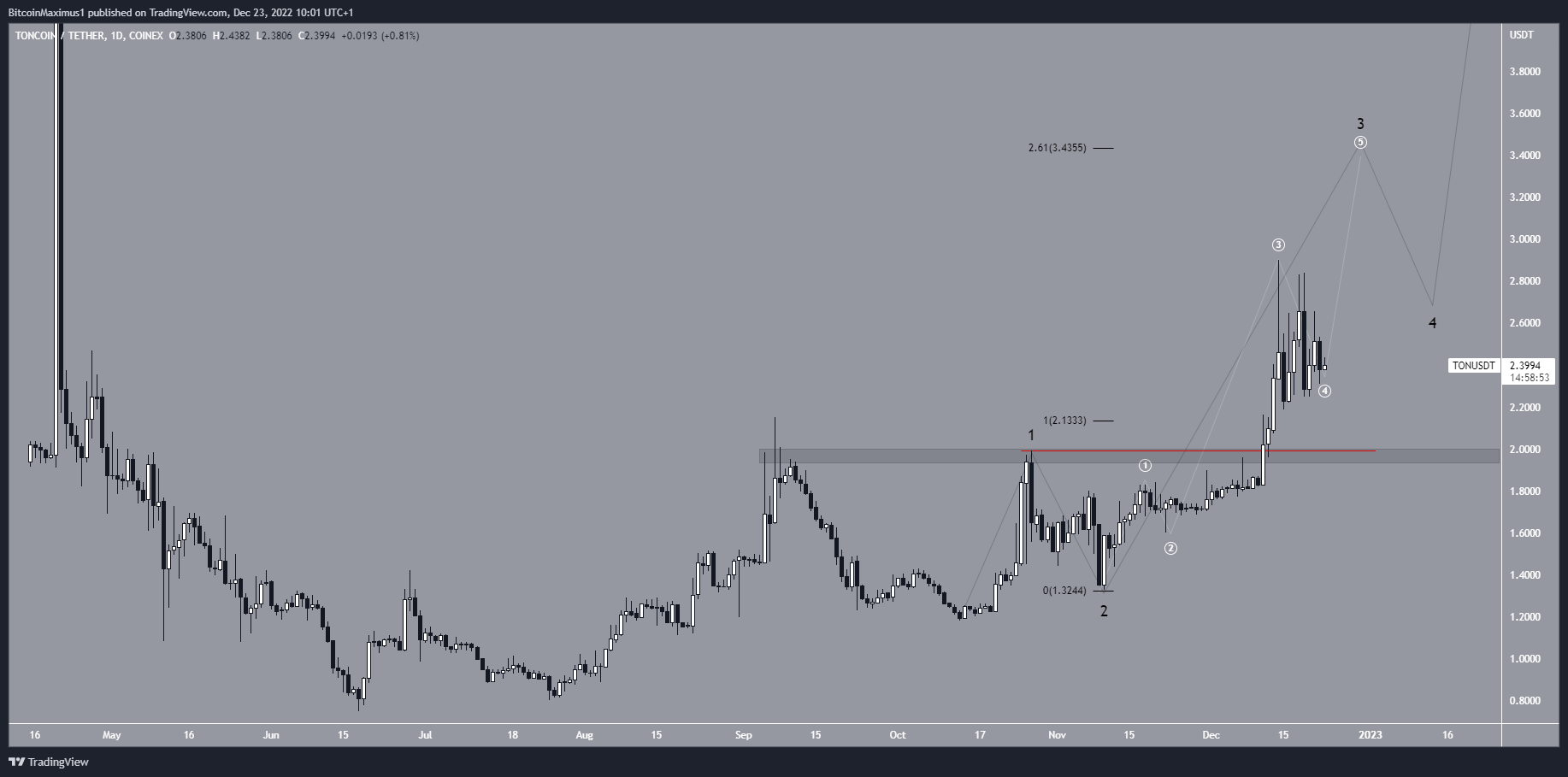 Chuyển động đi lên trông giống như một cấu trúc gồm 5 sóng tăng. Trong đó, TON ở sóng ba (màu đen) và sóng phụ năm (màu trắng). Theo đó, giá TON có thể đạt mức cao nhất tại 3.44 USD, cũng là đỉnh của con sóng này. Tuy nhiên, nếu TON giảm xuống dưới mức cao nhất của sóng (đường màu đỏ), thì giả thuyết tăng giá sẽ bị mất hiệu lực.