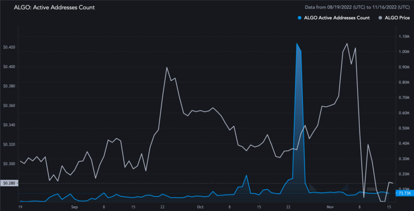 Số lượng địa chỉ hoạt động trên Algorand cho thấy rằng lượng địa chỉ hoạt động ở mức 73,733. Tuy nhiên, hãy nhìn vào một bức tranh dài hạn, các địa chỉ đang hoạt động bị chững lại trong phần lớn khoảng thời gian này của năm ngoái.