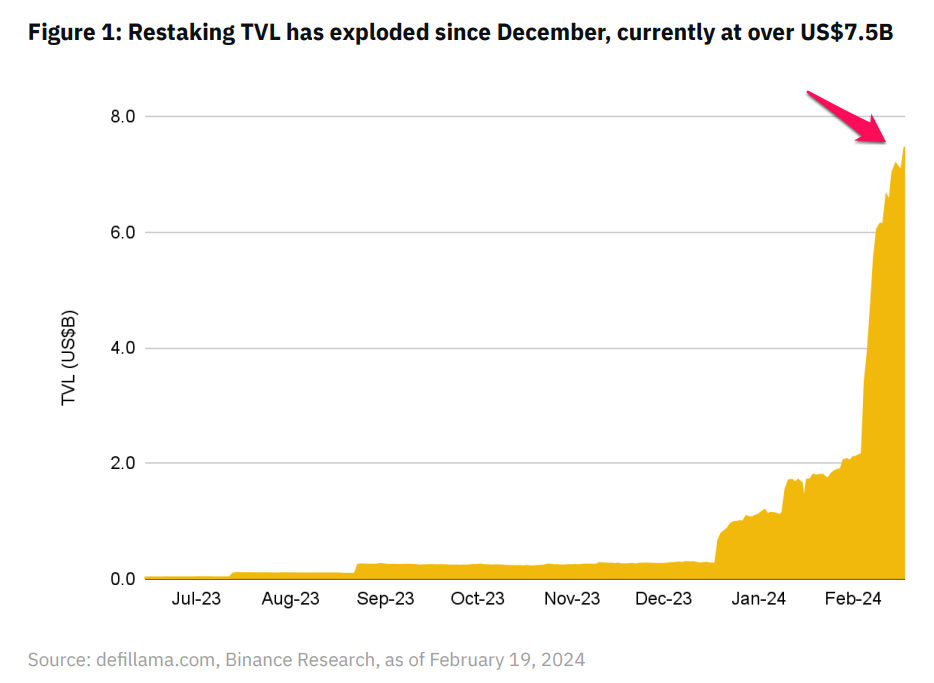 Năm 2023 thị trường chứng kiến sự gia tăng của các Liquid Staking Tokens (LST) thì đến năm 2024 thị trường chứng kiến sự gia tăng của Liquid Restaking Token (LRT). Nhà đầu tư đem ETH hoặc LST của mình để “staking lần nữa” vào các giao thức và tìm kiếm lợi nhuận. Ý tưởng hấp dẫn này đã khiến cho TVL của restaking nói chung và EigenLayer nói riêng bùng nổ.