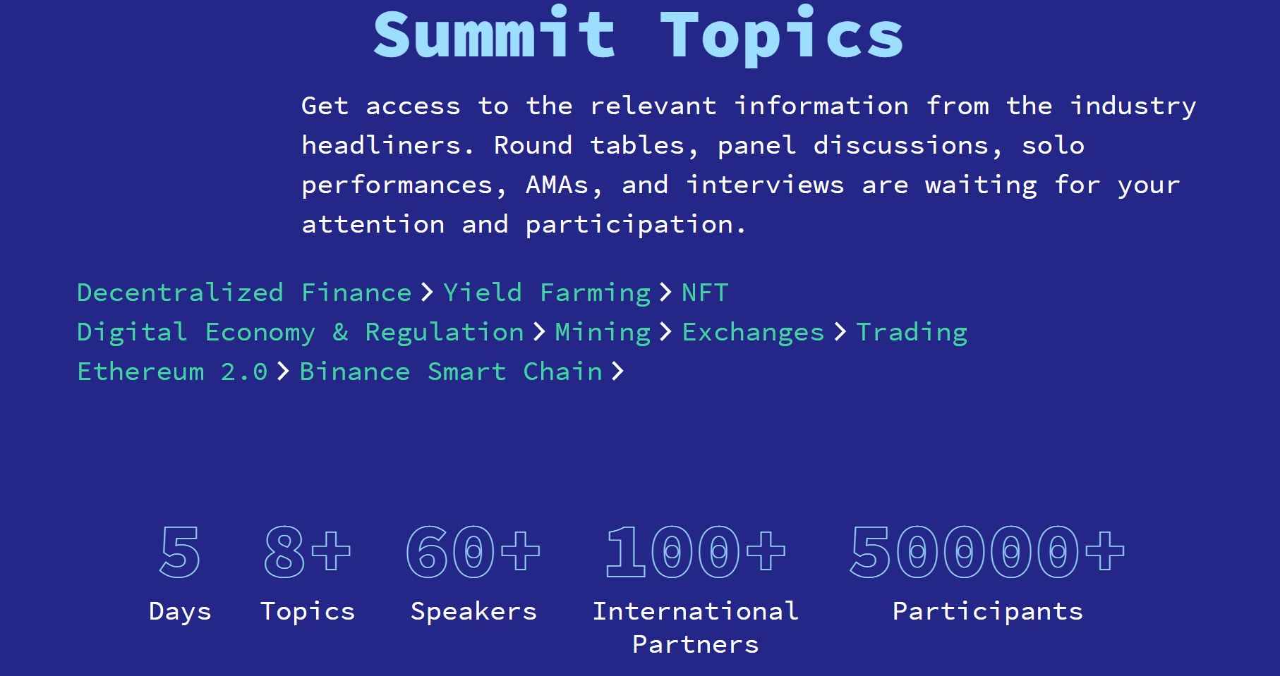 Ngoài ra, danh sách có sự xuất hiện của nhiều đại diện từ: Biconomy; sàn giao dịch Gate; Gather Network; đại diện từ Binance tại Nga, Solana, Marhaba DeFi;…Những chủ đề được đề cập trong hội nghị như Defi; NFT; Yield Farming; Ethereum 2.0, Binance Smart Chain; trade coin/token cũng hấp dẫn không kém.