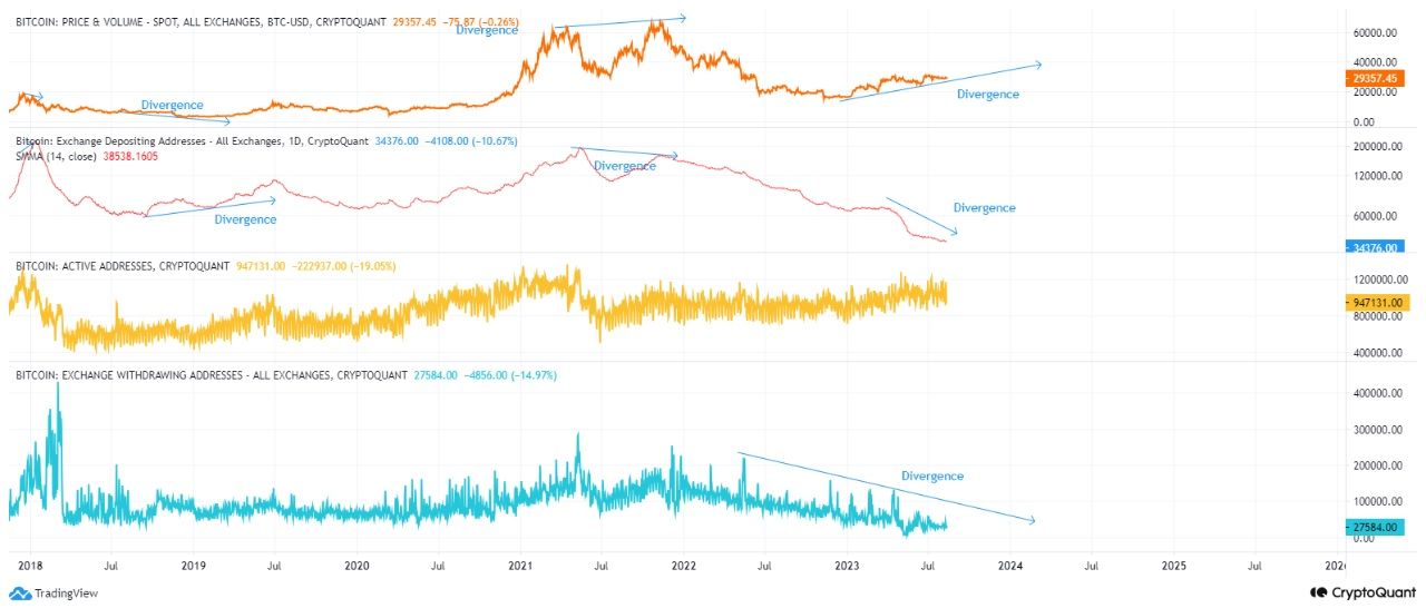 #1. Phân kỳ giữa lượng địa chỉ rút/nạp và giá Bitcoin