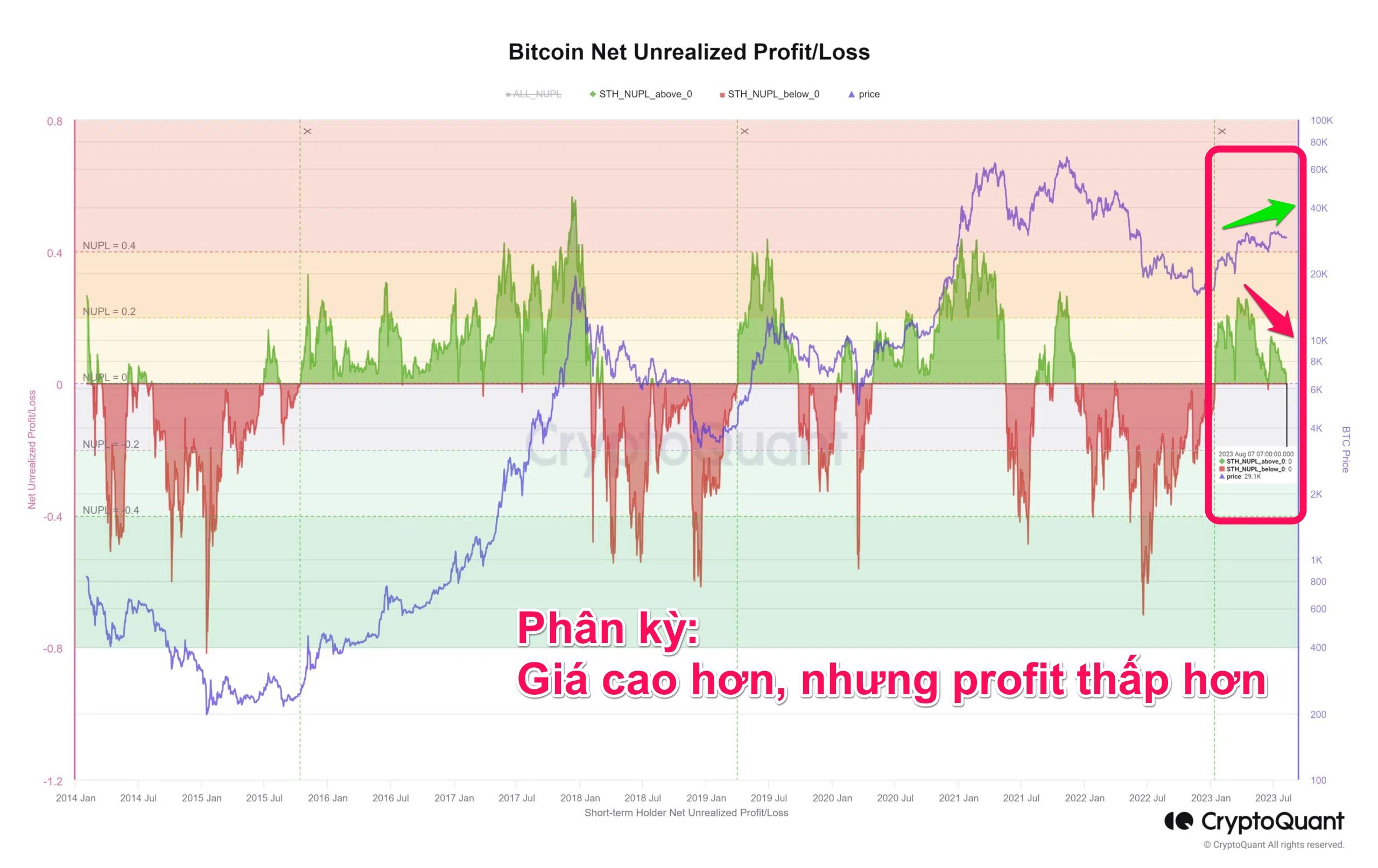 Chỉ báo on-chain khác cũng đang thể hiện tín hiệu phân kỳ với giá Bitcoin đó là Net Unrealized Profit/Loss (NUPL). Để tính ra dữ liệu này, người ta cho rằng giá thị trường của Bitcoin tại lần di chuyển cuối cùng xem như là giá mua. Rồi bắt đầu thực hiện so sánh giá mua đó với biến động của giá trị trường kể từ sau lần di chuyển cuối để xác định xem số BTC đó đang lời (profit) hay lỗ (loss).