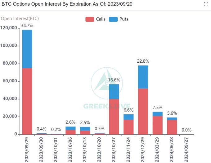Theo dữ liệu mới nhất từ GreeksLive được BeInCrypto ghi nhận vào lúc 7:25 AM ngày 29/9 (giờ Việt Nam), có tổng cộng 118,000 hợp đồng quyền chọn Bitcoin hết hạn (Bitcoin option). Điểm max pain của loạt hợp đồng quyền chọn hết hạn hôm nay là 26,500 USD. Giá trị danh nghĩa (notional value) ở ngưỡng 3.2 tỷ USD. Giá Bitcoin trên thị trường giao ngay hiện ở mức 26,959 USD.