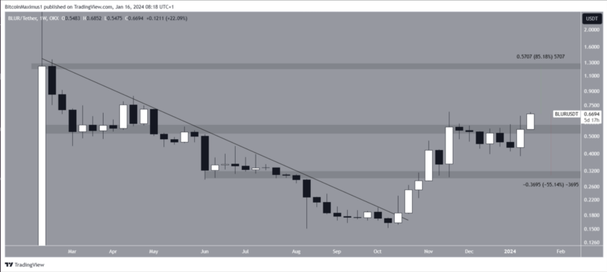 Kể từ khi thoát ra khỏi đường xu hướng kháng cự giảm dần vào tháng 10/2023, BLUR đã tăng lên. Xu hướng đi lên đã dẫn đến mức cao nhất là 0.69 USD vào tháng tiếp theo.