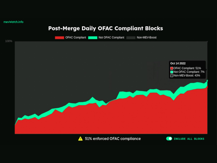 Vào thời điểm viết bài, 51% khối giao dịch Ethereum được xác định là tuân thủ OFAC theo thông tin mevWatch của trang web phân tích MEV.