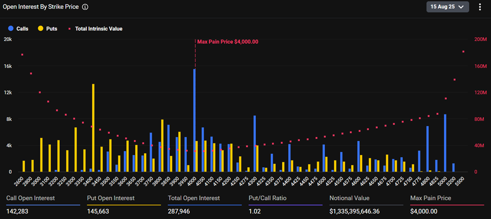 Dữ liệu trên Deribit cho thấy các tùy chọn ETH hết hạn hôm nay có giá trị danh nghĩa là 1.33 tỷ USD. Trong khi đó, lãi suất mở là 287,946 hợp đồng.