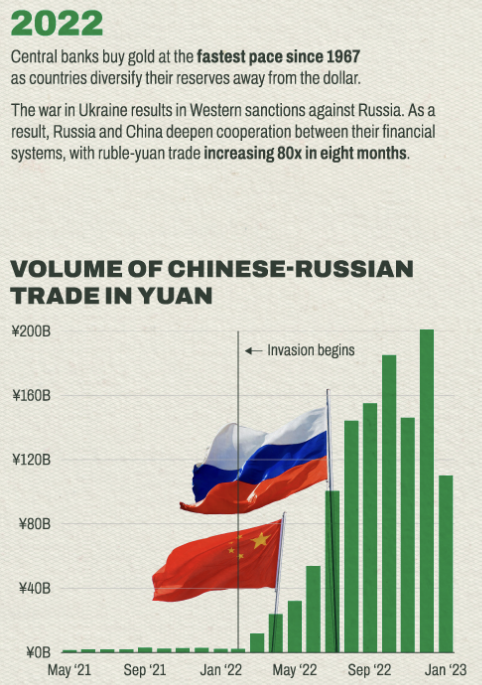 Theo đó, nền kinh tế lớn thứ hai thế giới này hiện đang muốn thực hiện các sáng kiến chiến lược về đồng nhân dân tệ của mình nhằm mục đích suy yếu đi quyền bá chủ toàn cầu của đồng đô la Mỹ. Các biện pháp trừng phạt kinh tế gần đây mà Nga phải gánh chịu đã cho phép Trung Quốc thúc đẩy tiềm năng của đồng nhân dân tệ trong thương mại để thay thế việc dựa trên đồng đô la.
