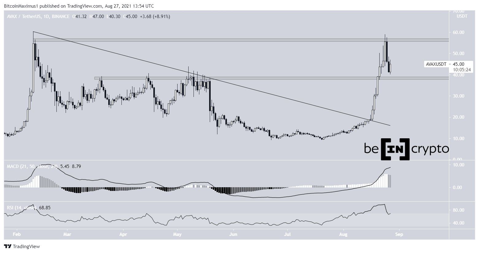 Vào ngày 16 tháng 8, AVAX đã bứt phá khỏi đường kháng cự giảm dần. Giá tiếp tục tăng với tốc độ nhanh và đạt mức cao $58.98 vào ngày 24 tháng 8. Mức cao này chỉ thấp hơn một chút so với mức ATH hiện tại là $60.20.