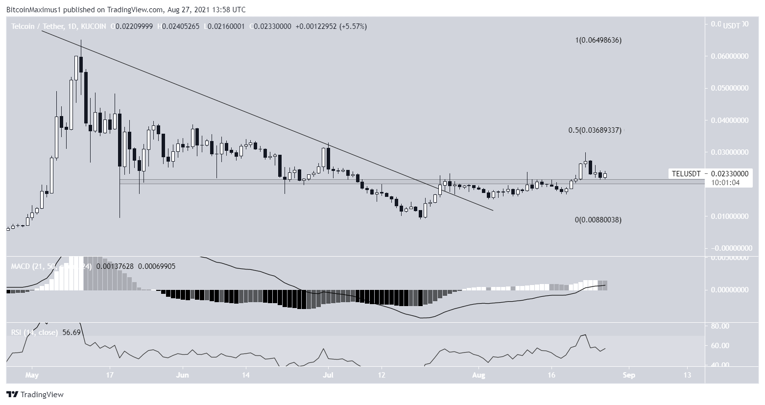 TEL đã tăng lên kể từ ngày 20 tháng 7. Ba ngày sau đó, nó đã bứt phá khỏi đường kháng cự giảm dần. Và lấy lại vùng kháng cự ngang $0.0205 vào ngày 22 tháng 8. Tiếp đến, giá đã đi lên và đạt mức cao $0.0298 vào ngày hôm sau trước khi bắt đầu giảm.