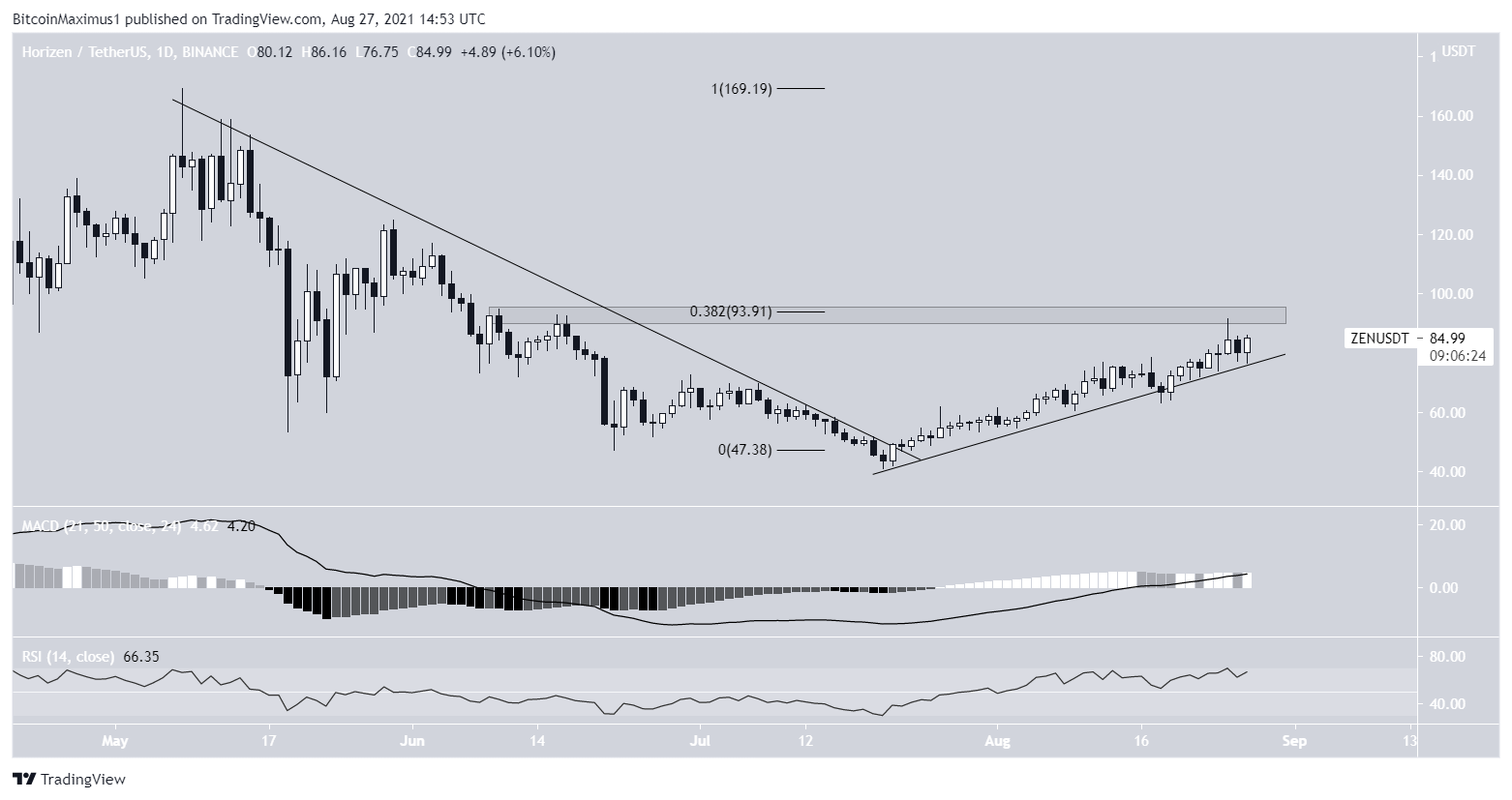 ZEN đã tăng lên kể từ khi thoát ra khỏi đường kháng cự giảm dần vào ngày 22 tháng 7. Giá tiếp tục tăng cho đến khi đạt được mức cao nhất là $91.73 vào ngày 25 tháng 8.