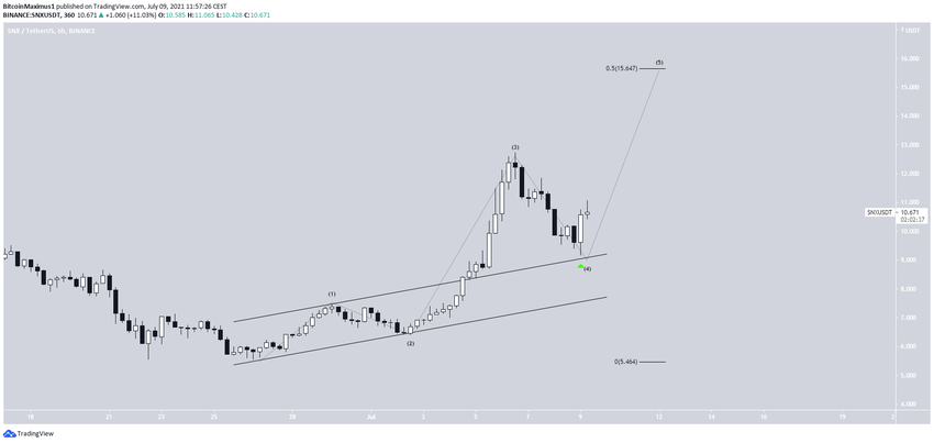 SNX bắt đầu xu hướng tăng kể từ ngày 26 tháng 6. Đến ngày 4 tháng 7, altcoin này đã bứt phá khỏi một kênh song song tăng dần. Hai ngày sau, giá chạm đỉnh tại 12.74 USD.