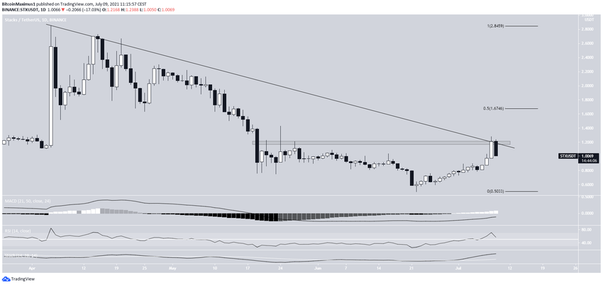 STX đã tăng lên kể từ khi chạm mức thấp 0.5 USD vào ngày 22 tháng 6. Đến ngày 8 tháng 7, altcoin này chạm đỉnh tại 1.28 USD. Đây là lần thứ ba nó chạm đến đường kháng cự giảm dần này. Đây cũng đồng thời là vùng kháng cự nằm ngang.