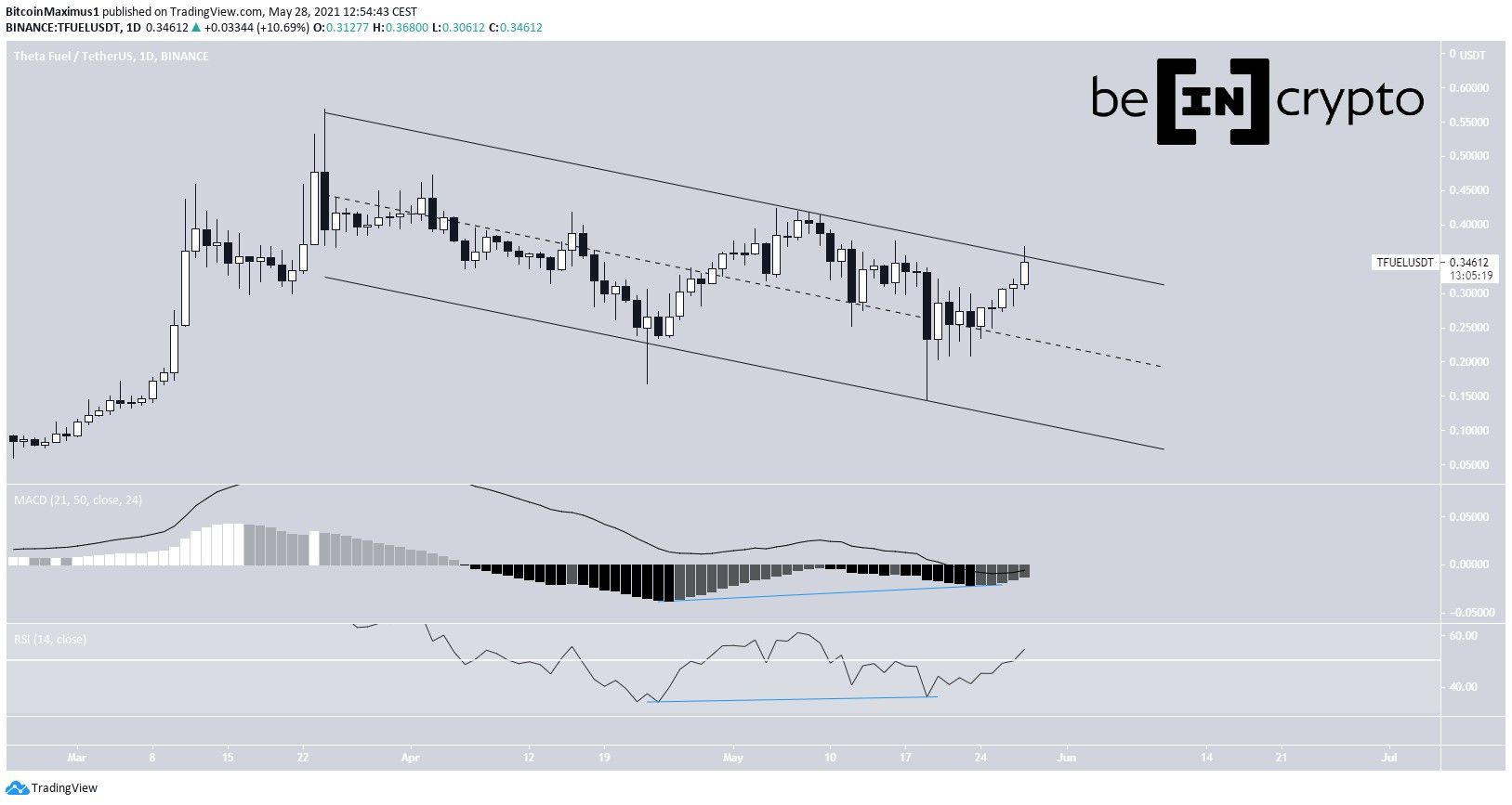 TFUEL đạt mức giá cao nhất mọi thời đại vào ngày 24 tháng 3 ở $0.568. Kể từ đó, TFUEL đã giao dịch trong một kênh song song giảm dần. Các mô hình như thế này thường được hình thành trong quá trình thoái lui. Giá đã chạm đến đường hỗ trợ vào ngày 19 tháng 5 và bắt đầu phục hồi.