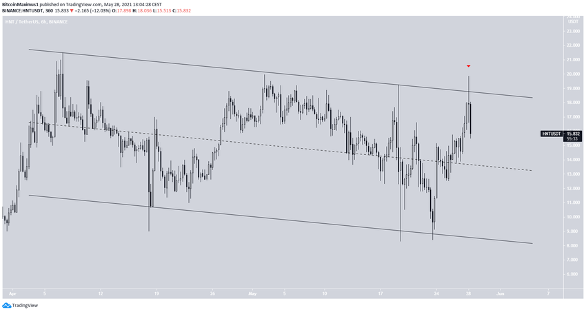 HNT cũng gặp tình trạng như THETA và TFUEL. Giá đang di chuyển trong một kênh song song hướng xuống. Kênh này đã được hình thành kể từ ngày 7 tháng 4, kể từ khi giá HNT đạt mức cao nhất mọi thời đại tại $21.50.