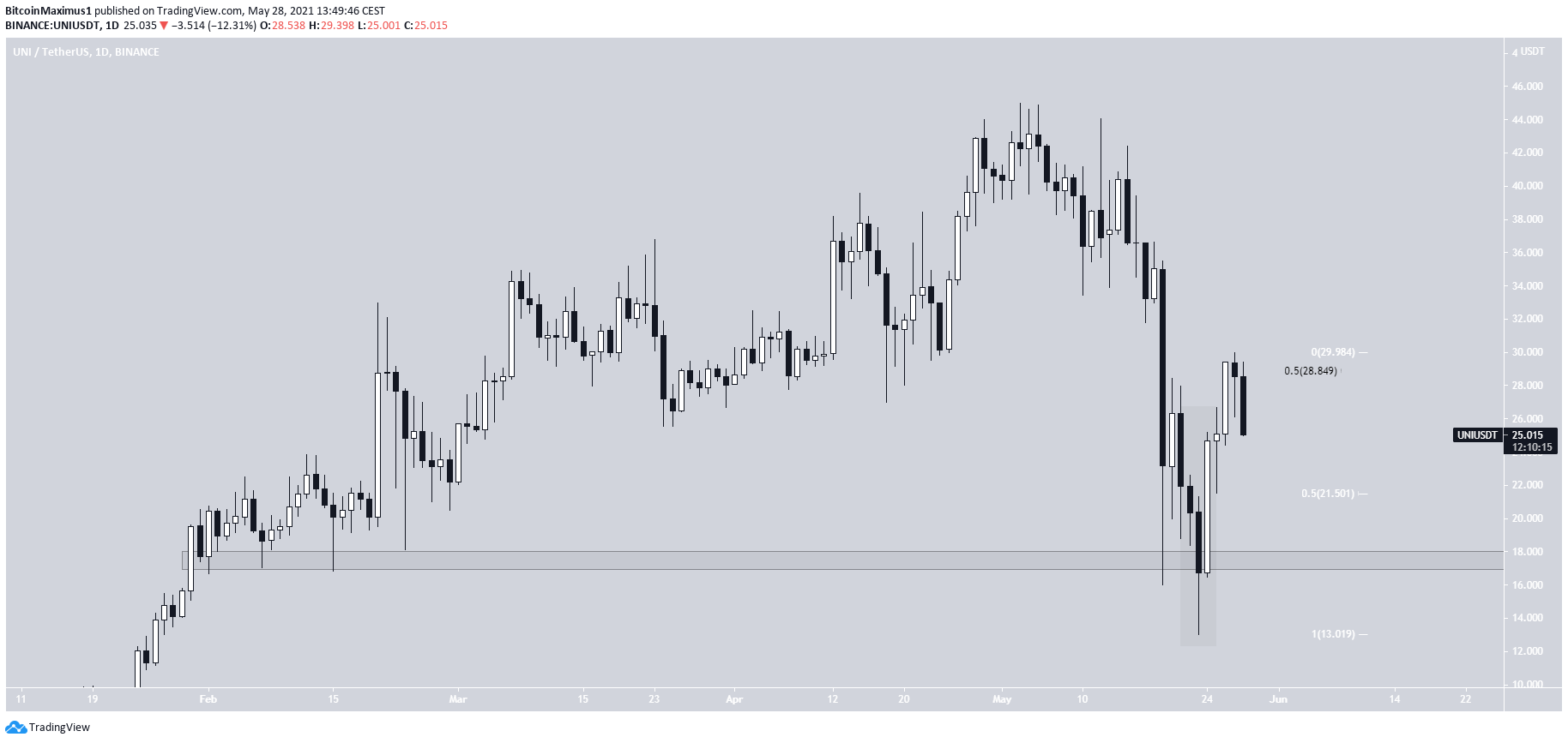 UNI chạm mức thấp nhất vào ngày 23 tháng 5 ở $0.13. Sau đó, giá hình thành một cây nến nhấn chìm trong xu hướng tăng. Giá tiếp tục giảm xuống mức thoái lui Fibonacci 0.5 ở mức $0.28 đô la. Hiện tại, UNI vẫn chưa vượt qua được mức này. Giá đang tiếp tục giảm.
