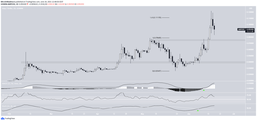 Tương tự với QNT, AMP đã chạm mốc ATH mới là 0.121 USD vào ngày 16 tháng 6. Mức cao này đạt được ngay tại mức Fibo kháng cự thoái lui bên ngoài 1.61 ở 0.11 USD.