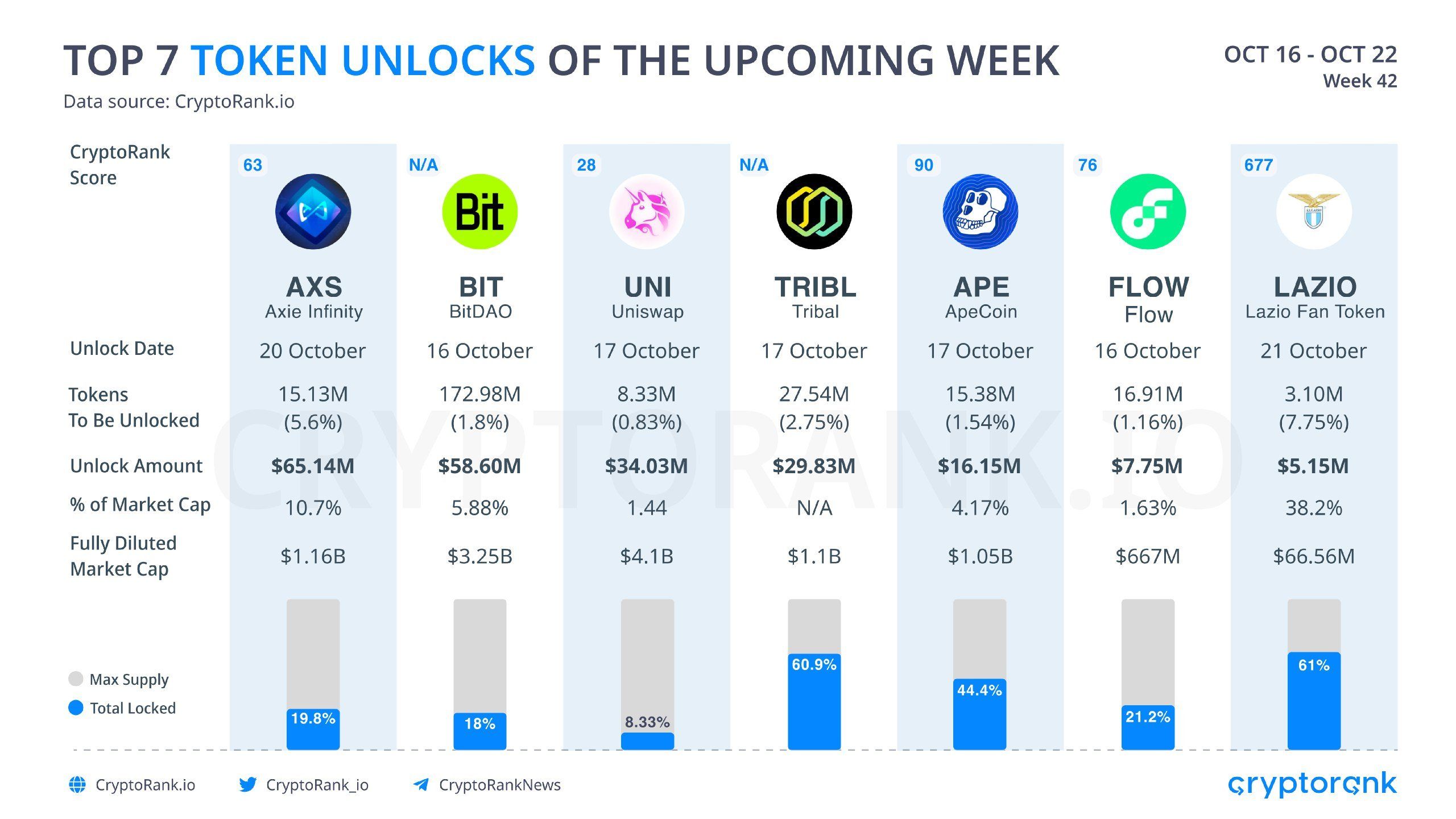 - ApeCoin (APE): unlock 15.38 triệu APE vào ngày 17/10, tương đương 4.17% nguồn cung, trị giá khoảng 16.15 triệu USD.
