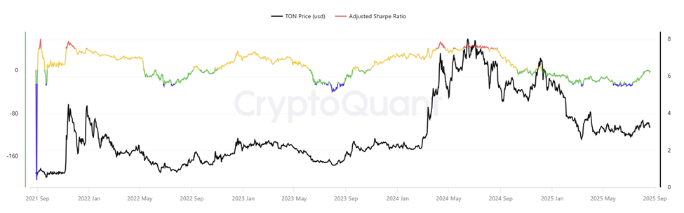 Hiệu suất trên chuỗi của TON cho thấy dấu hiệu mạnh mẽ ngoài việc được chấp nhận bởi các tổ chức và nhà đầu tư nhỏ lẻ. Theo dữ liệu trên CryptoQuant, tỷ lệ Sharpe của nó, một thước đo lợi nhuận điều chỉnh rủi ro, đã chuyển từ âm sang dương vào tháng 08. Chỉ số lịch sử này cho thấy động lực tăng bền vững.