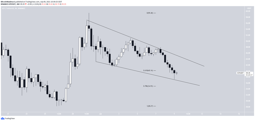 Vùng hỗ trợ tiếp theo có thể được tìm thấy tại 35 USD, nằm tại mức điều chỉnh Fibo 0.786. Có lẽ ICP hiện đang giao dịch bên trong một nêm giảm.