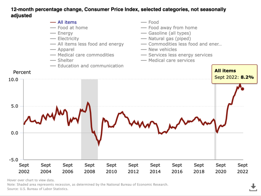 Chỉ số giá tiêu dùng (CPI) cho ngày 10/10/2022 dự kiến sẽ được công bố vào ngày 10/11/2022, lúc 8:30 sáng giờ phương Tây. Tỷ lệ CPI cho tháng 9 được công bố là 8.2%, chỉ giảm 0.1% so với tỷ lệ 8.3% của tháng 8.