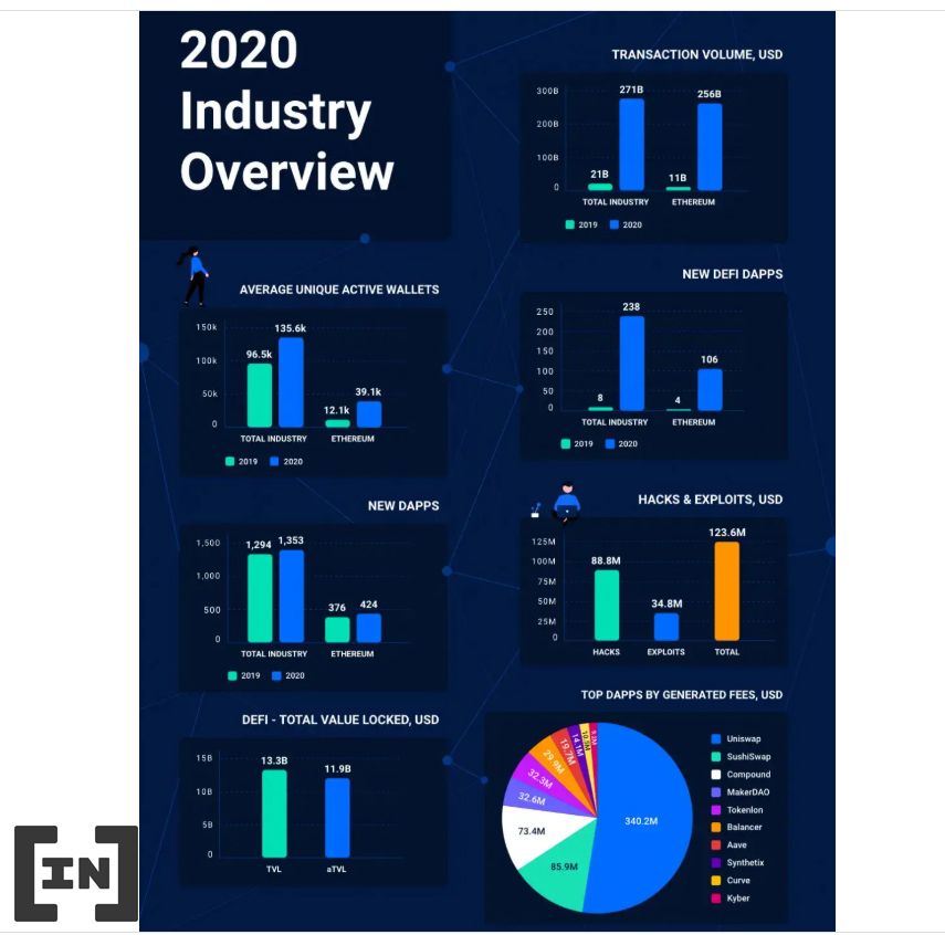 Báo cáo này tuyên bố rằng vào năm 2020, “10 dApp DeFi hàng đầu chịu trách nhiệm cho 87% khối lượng giao dịch Ethereum, tương đương 223 tỷ đô la vào năm 2020”.