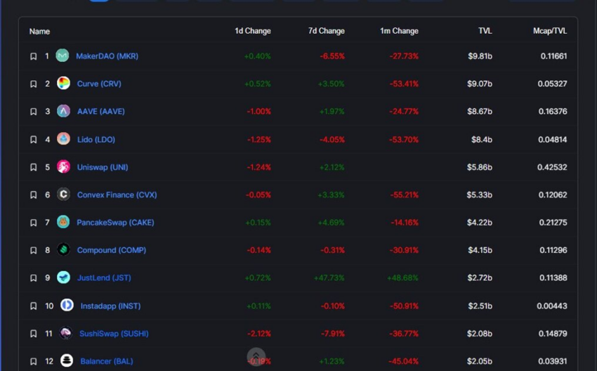 Mặc dù tổng giá trị bị khóa giảm, Aave vẫn có TVL tương đối cao các nền tảng khác như Lido, Uniswap, Convex Finance, PancakeSwap, Compound, JustLend, Instadapp, SushiSwap và Balancer.