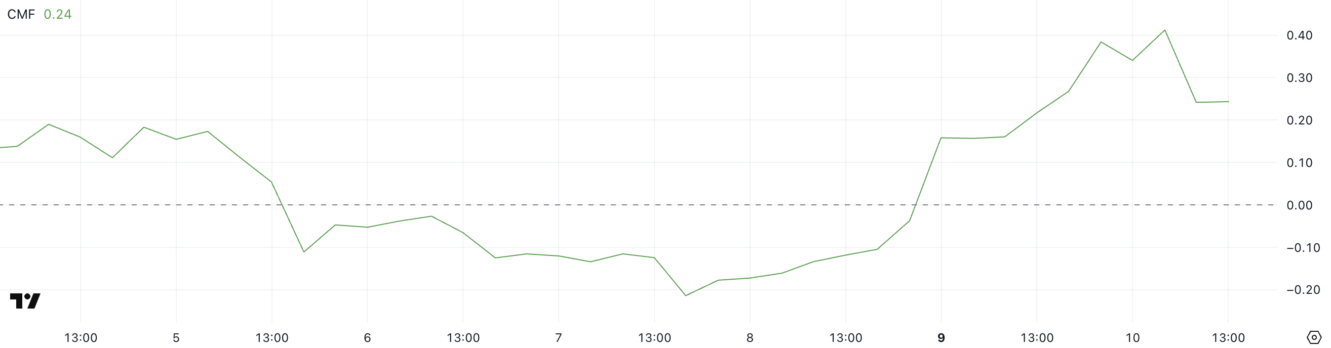 Với CMF ở mức 0.24, dữ liệu cho thấy sự tích lũy bền vững, mặc dù sự giảm từ 0.41 cho thấy một số người mua có thể đang chốt lời hoặc động lực có thể đang hạ nhiệt một chút.