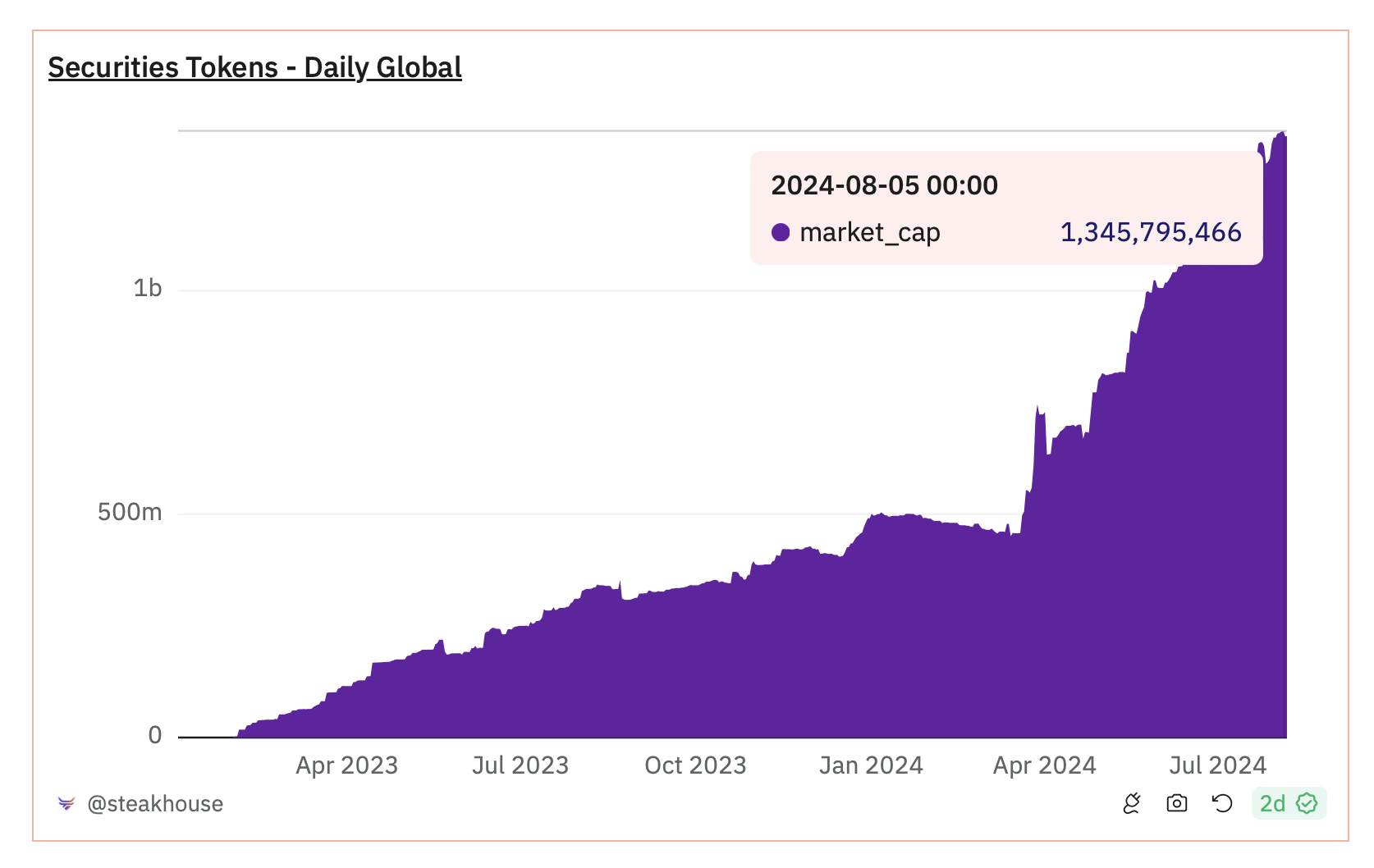 Xu hướng này đang thu hút sự chú ý trong năm 2024, thu hút các tập đoàn lớn như BlackRock, đã chi trả 2.1 triệu USD tiền cổ tức vào tháng 7. Các dự án nổi bật khác trong lĩnh vực mã hóa chứng khoán bao gồm Ondo Finance và Franklin Templeton. Cùng nhau, họ có tổng vốn hóa thị trường vượt quá 1.3 tỷ USD.
