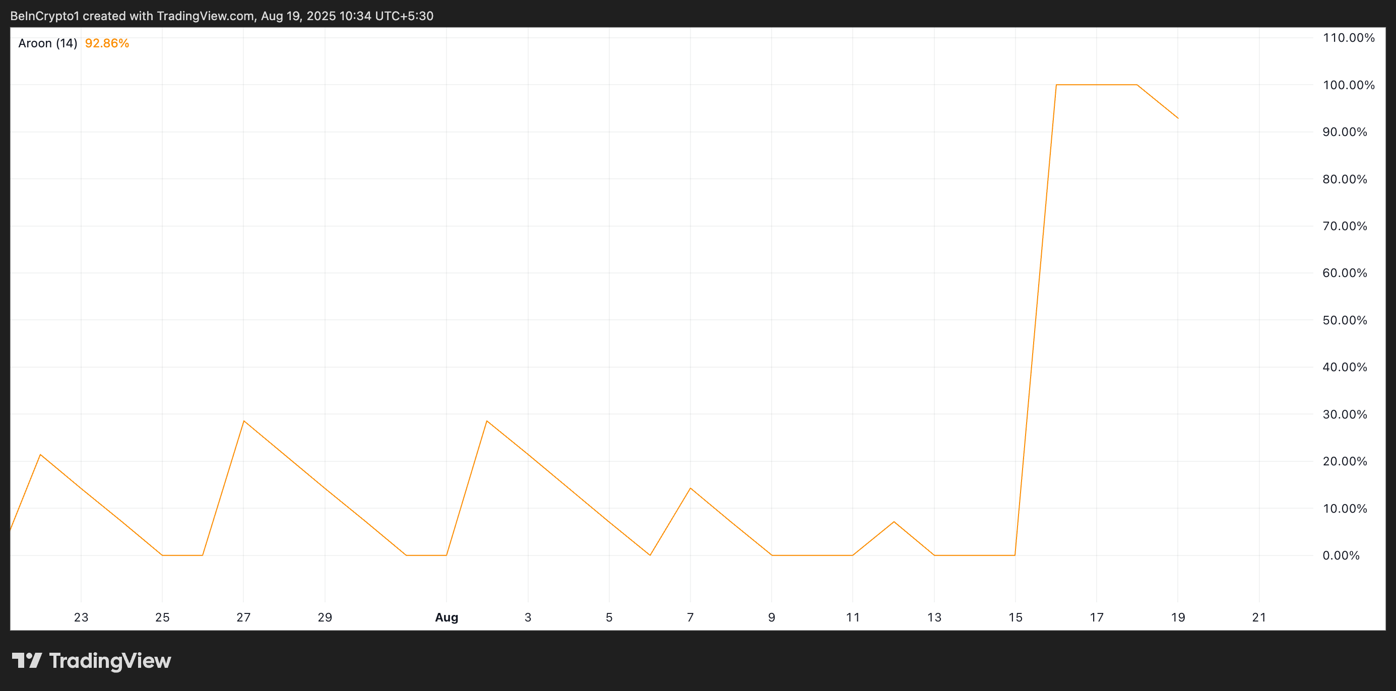 Trên biểu đồ hàng ngày, Aroon Up Line của AB xác nhận sức mạnh của đợt tăng giá hiện tại. Tại thời điểm viết bài, chỉ số này đang ở mức 92.86%, cho thấy áp lực mua mạnh mẽ từ phía thị trường.