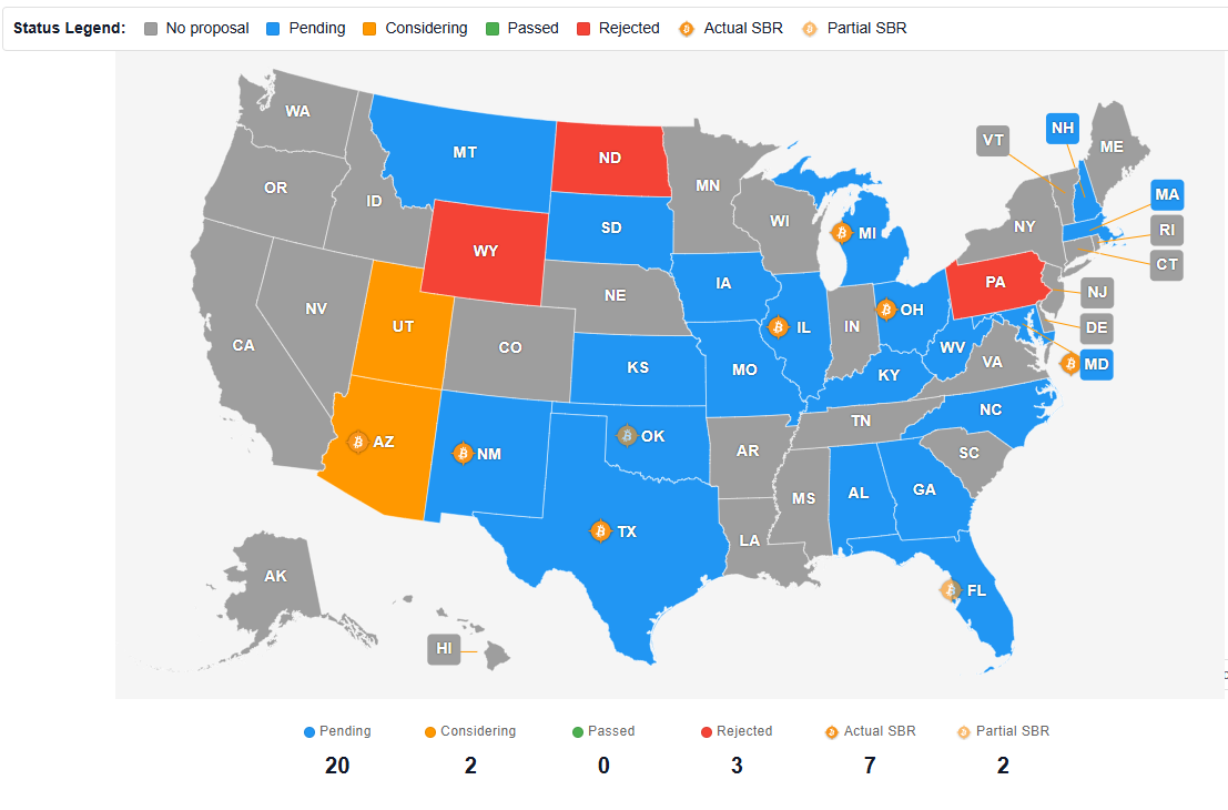 Trong khi lập trường của chính phủ liên bang vẫn chưa rõ ràng, một số bang của Mỹ đã thực hiện các bước độc lập để tích hợp Bitcoin vào chính sách tài chính của họ. Hơn 20 bang đã đề xuất hoặc ban hành luật để tạo điều kiện cho các khoản đầu tư tiền điện tử.