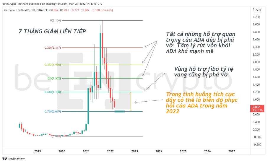 - Từ mức giá đỉnh hơn 3 USD hồi tháng 9 năm ngoái cho đến nay, ADA đã giảm hơn 75%. Tất cả những hỗ trợ quan trọng của nhiều phân tích kỹ thuật trước đó như vùng 2 USD, vùng 1.5 USD thậm chí vùng 1 USD đều đã bị phe gấu xuyên phá hết. Điều này khiến cho hầu hết những ai mua ADA kể từ tháng 3 năm ngoái cho đến nay đều đang lỗ.