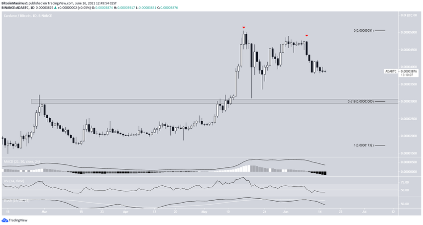 Biểu đồ ADA / BTC cũng cho thấy, kể từ ngày 16 tháng 5, xu hướng giảm đã diễn ra. Vào ngày 9 tháng 6, nó đã tạo ra mức đỉnh thấp hơn (các biểu tượng màu đỏ). Và sau đó tiếp tục xu hướng giảm.
