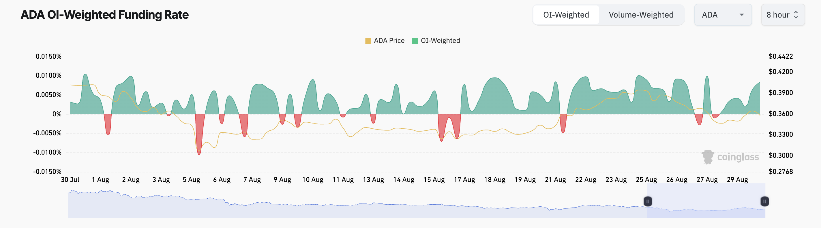 Thú vị là, các nhà giao dịch phái sinh của ADA dường như không bị ảnh hưởng bởi những lo ngại “bán tin tức”. Họ tiếp tục mở các vị thế Long, như được chỉ ra bởi tỷ lệ tài trợ (funding rate) dương của đồng tiền. Tại thời điểm bài viết, tỷ lệ tài trợ của ADA là 0.0084%.