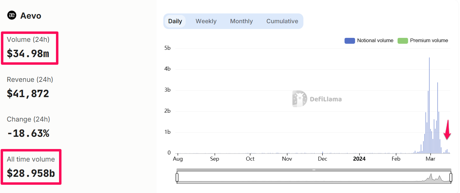 Aevo là một sàn giao dịch phái sinh phi tập trung dành cho các hợp đồng quyền chọn. Quan sát dữ liệu khối lượng trên sàn trong tháng 3 cho thấy sự tăng giảm bất thường. Khối lượng giao dịch 24h hiện tại chỉ chưa đến 35 triệu USD, nhưng có ngày 29/2 khối lượng trên AEVO lên đến hơn 4.5 tỷ USD.