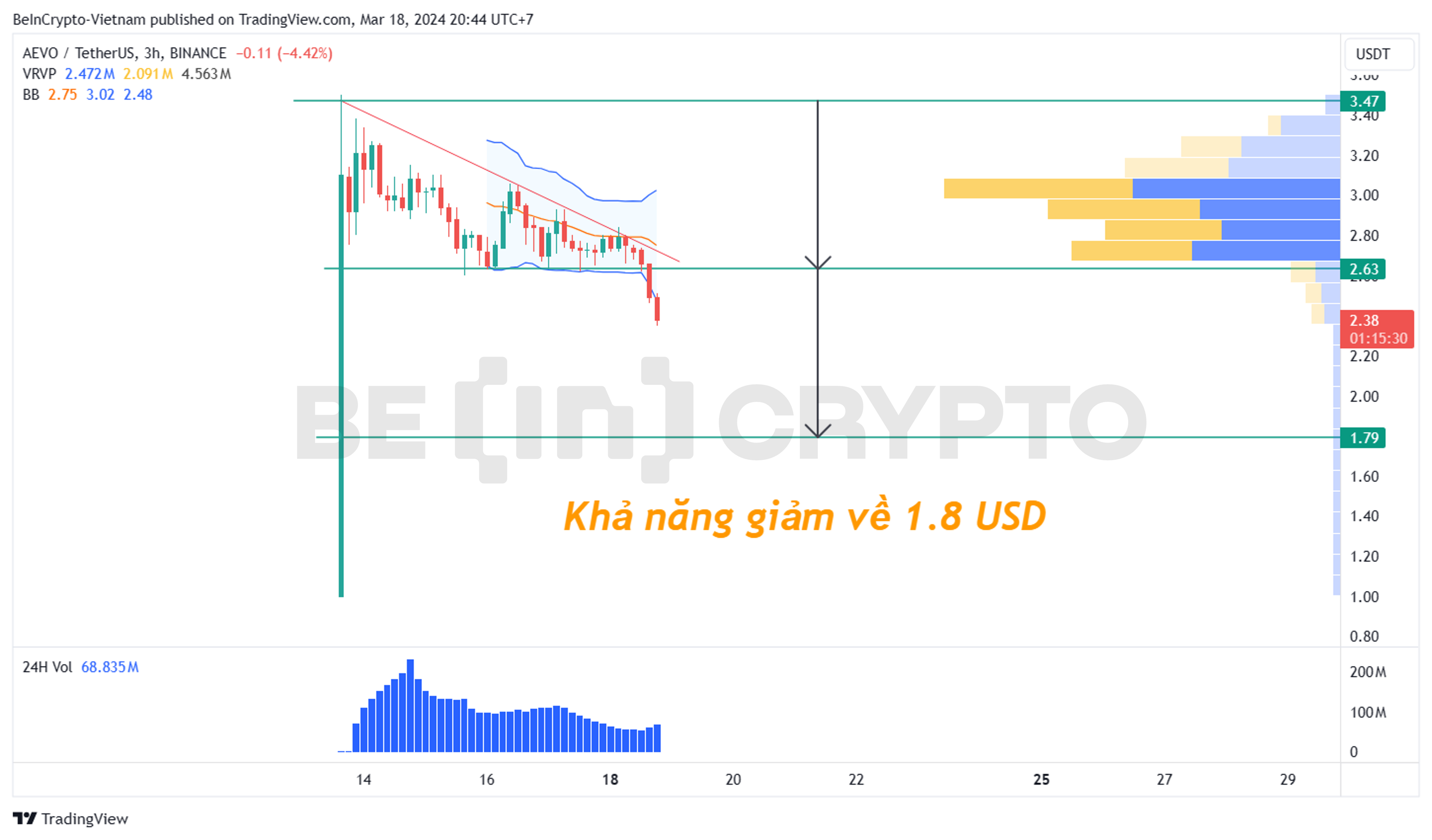 - Giá AEVO cũng ra khỏi vùng thanh khoản tốt của những ngày qua được xác định bởi volume profile. Chỉ báo Bollinger Band khung 3h cũng đã mở biên xuống dưới.