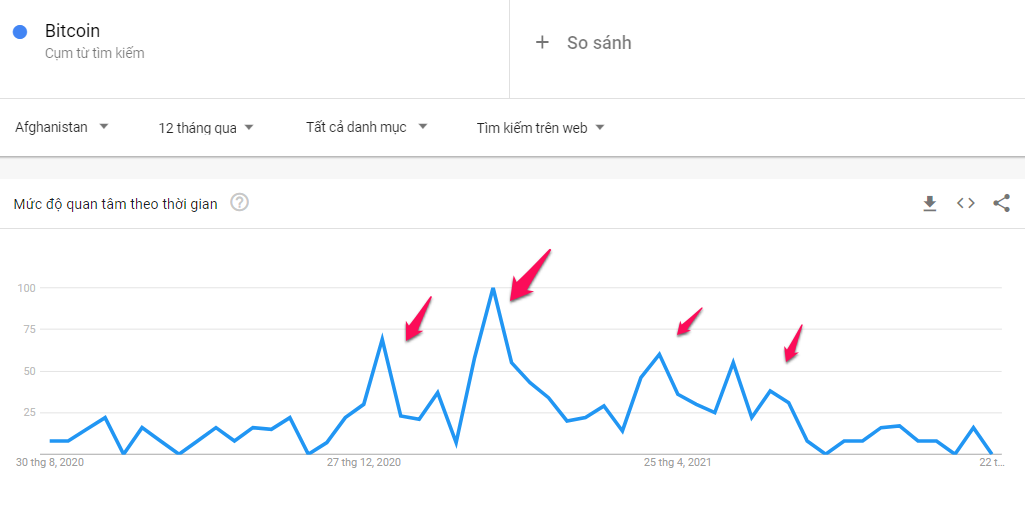 Trái ngược bởi biểu đồ sụt giá của nội tệ. Trong khoảng thời gian tháng 12/2020 – 7/2021 tương ứng như trên, cũng là lúc mối quan tâm đến Bitcoin tăng cao.