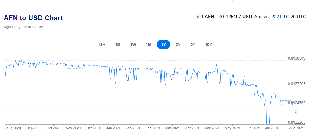 - Afghanistan vốn là quốc gia chuộng tiền mặt. Trong tình cảnh chính trị bất ổn, nội tệ cũng sụt giảm mạnh kể từ tháng 7 đến nay.