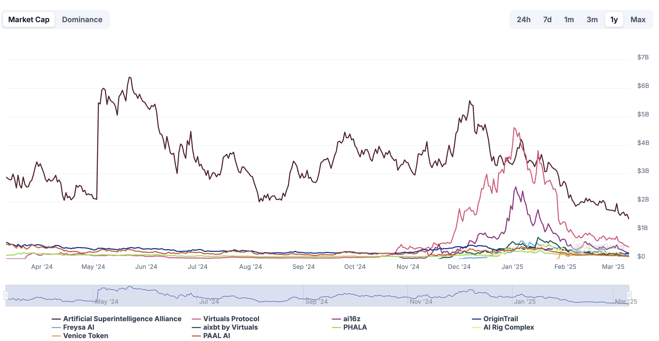 Sự suy giảm đã ảnh hưởng đến gần như tất cả các token AI, với hầu hết theo một quỹ đạo tương tự trong thị trường tiền điện tử.