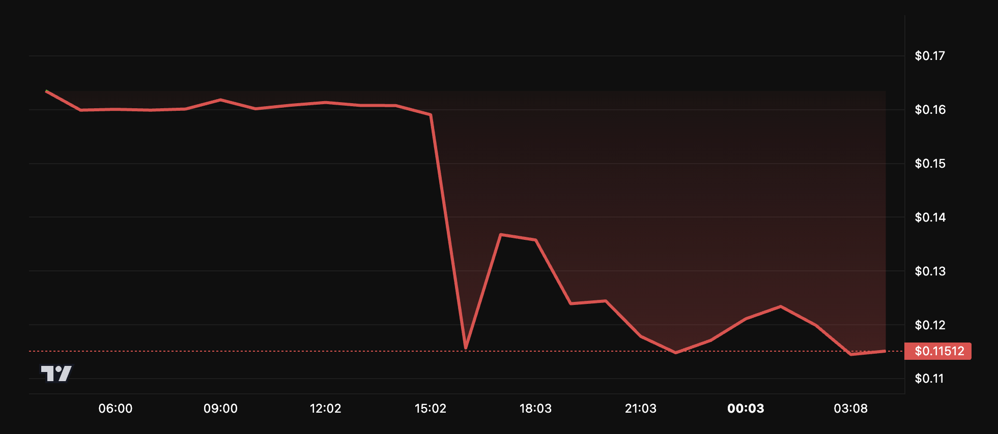 Tuy nhiên, lợi nhuận này không kéo dài, và tin tức mới nhất đã đẩy giá xuống thấp hơn. Dữ liệu từ BeInCrypto cho thấy giá của ALPACA đã giảm 32.1% trong ngày qua. Tại thời điểm viết bài, giá giao dịch của token là 0.11 USD.