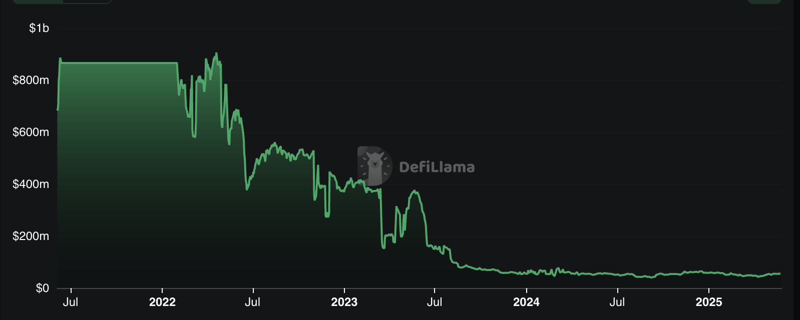 Dữ liệu từ DefiLama cho thấy Tổng Giá Trị Khóa (TVL) của Alpaca Finance đã đạt mức cao kỷ lục hơn 900 triệu USD vào đầu năm 2022. Tuy nhiên, kể từ đó, nó đã liên tục giảm. Theo dữ liệu mới nhất, TVL chỉ còn 54.6 triệu USD.