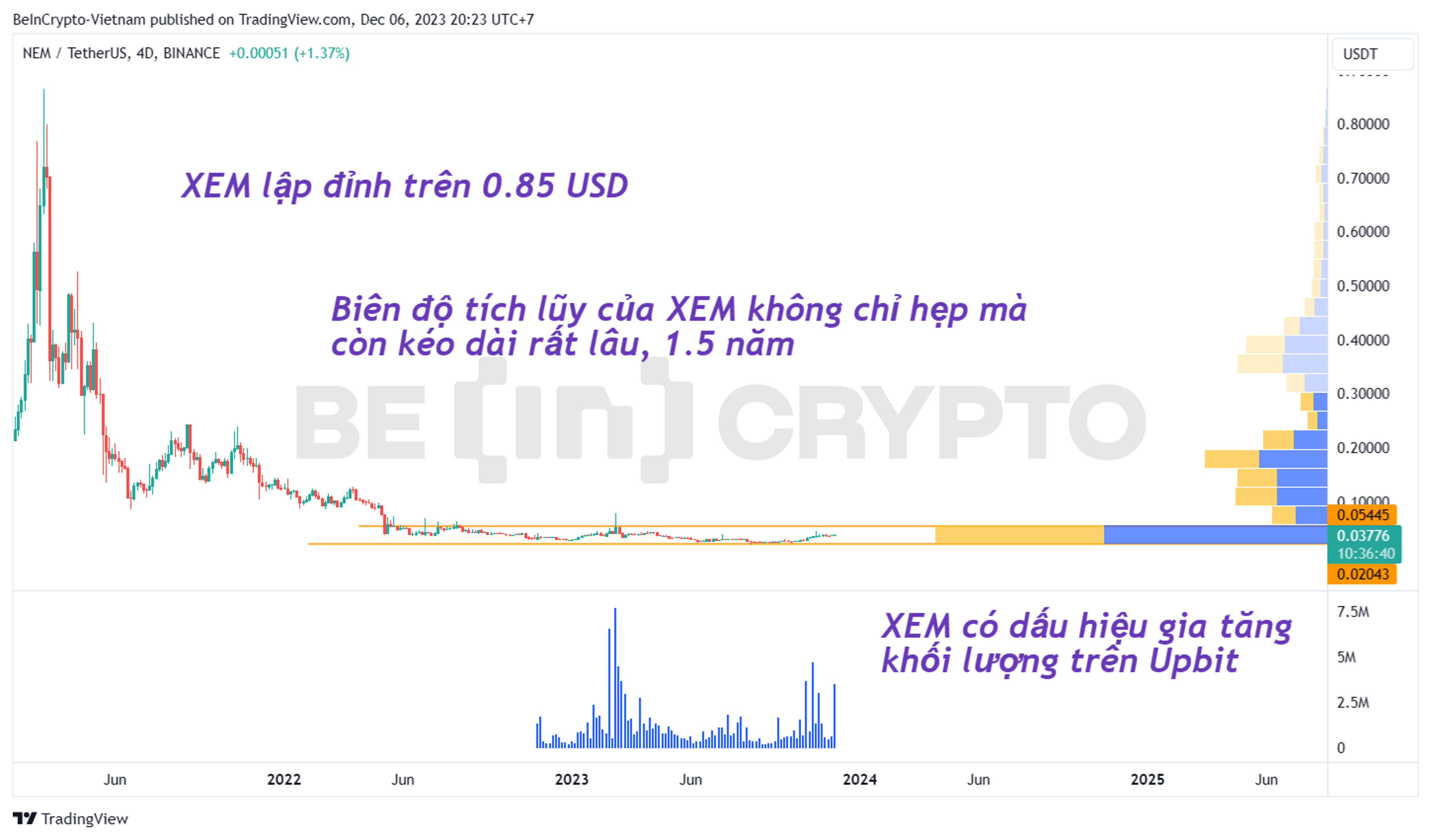 - Biên độ tích lũy của XEM cũng khá hẹp, từ 0.02 USD – 0.05 USD. Biên độ không chỉ hẹp mà còn kéo dài 1.5 năm qua. Cấu trúc tích lũy này giúp nhà giao dịch dễ chia vốn.