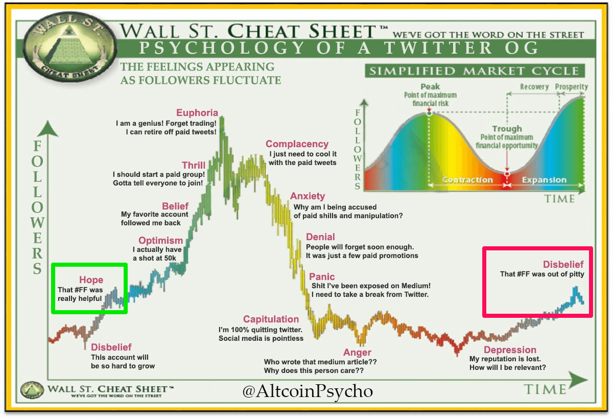 Quan sát biểu đồ TOTAL2, TOTAL3 trên và so sánh với biểu đồ chu kỳ tâm dưới đây, có thể nhận định Altcoin đang trong giai đoạn chuyển tiếp từ “Disbelief” (màu đỏ) sang “Hope” (màu xanh).