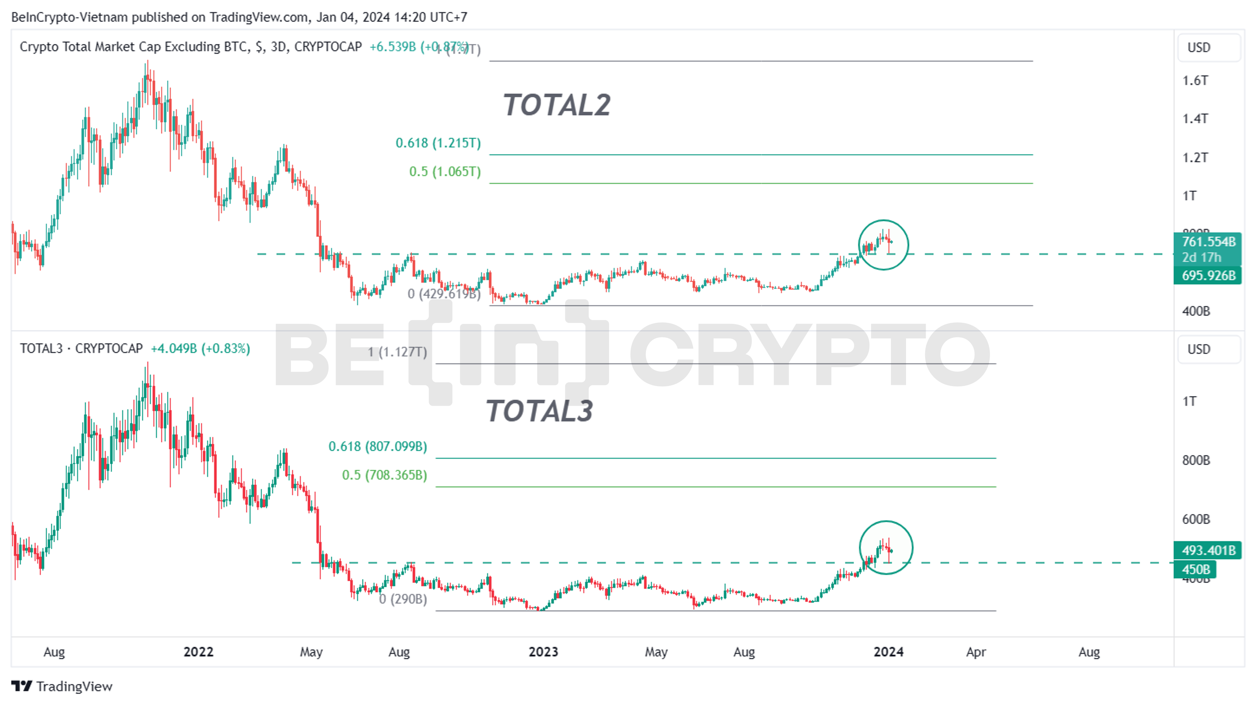 - Tương tự, TOTAL3 cũng đã điều chỉnh về 450 tỷ USD trong vài giờ như dự đoán trong phân tích trước. Việc vốn hóa TOTAL3 giảm về vùng 450 tỷ USD đồng nghĩa với việc nhiều Altcoin sẽ giảm về mức hỗ trợ quan trọng của năm 2024. Đây là vùng mua theo phân tích kỹ thuật, và target của TOTAL3 là khoảng 700 tỷ USD.