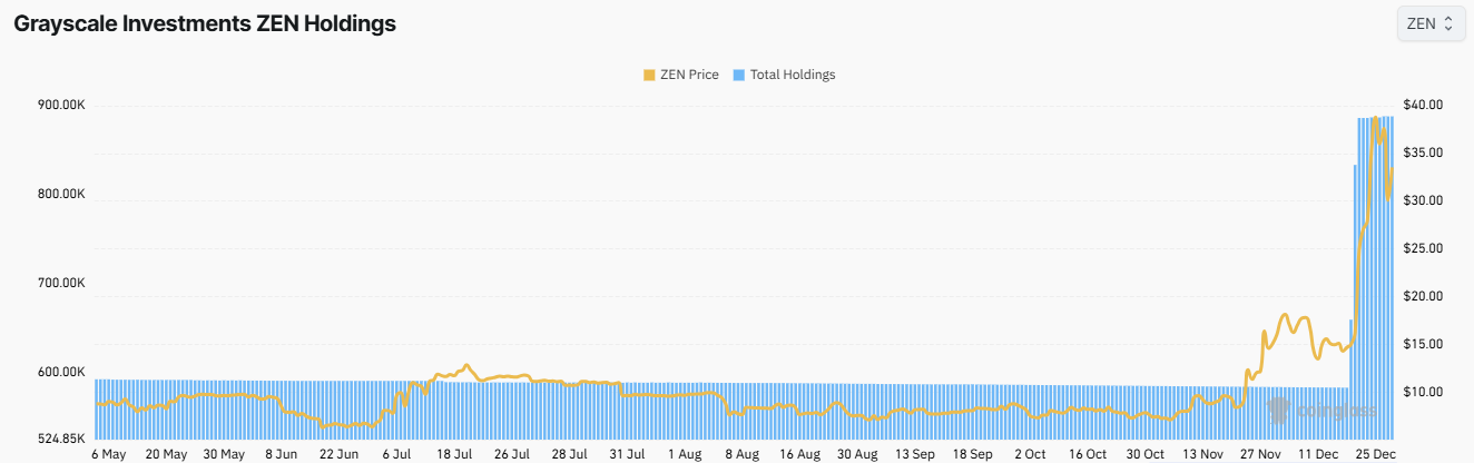 Dữ liệu CoinGlass cho thấy, trong tháng 12, Grayscale đã có động thái tích lũy Horizen (ZEN). Động thái này đáng chú ý là bởi, đó là hoạt động tích lũy đầu tiên sau gần 4 năm Grayscale nắm giữ ZEN. Song song với đó, giá ZEN trong tháng 12 đã ghi nhận biên độ tăng đến 240%.