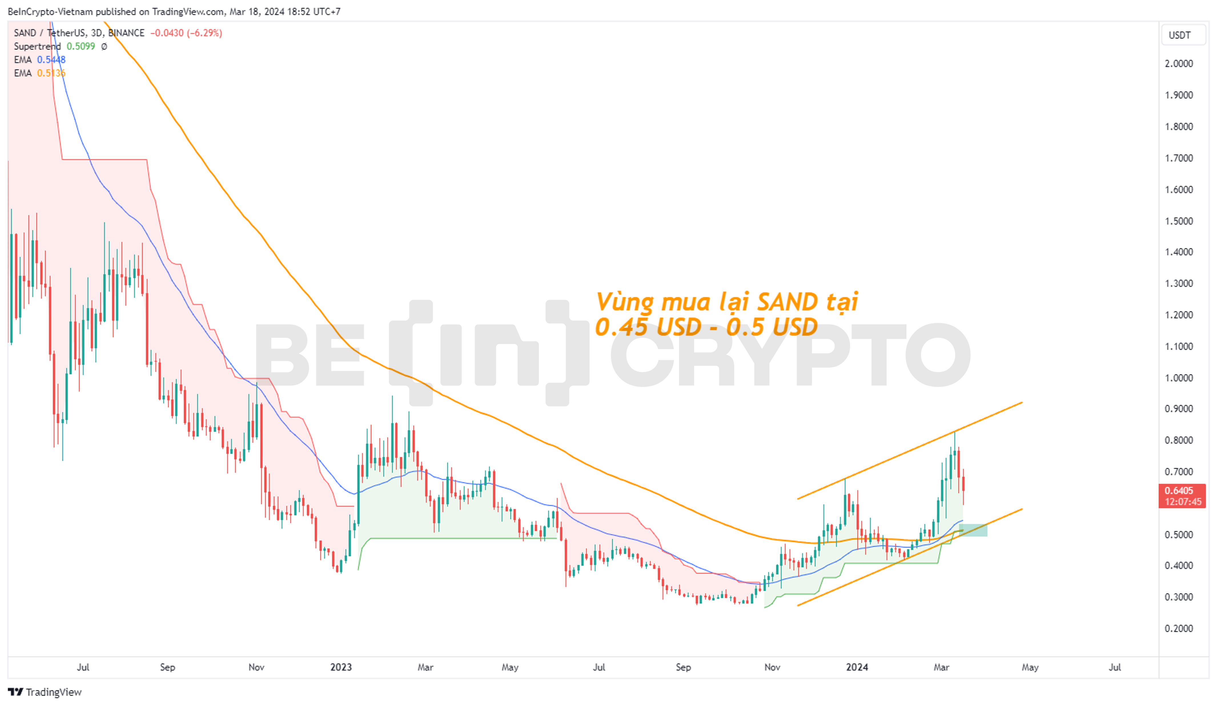 Có 3 tín hiệu kỹ thuật ủng hộ vùng cơ hội mua SAND tại 0.45 USD – 0.5 USD. Thứ nhất đây là vùng giá giữa EMA34 và EMA89 khi hai EMA này đã xác nhận giao cắt dương khung 3 ngày. Thứ hai, chỉ báo Super Trend đang xác nhận đây là hỗ trợ tốt của SAND trong đà điều chỉnh hiện tại. Thứ ba, đây cũng là vùng trendline của kênh giá song song của SAND trong năm 2024.