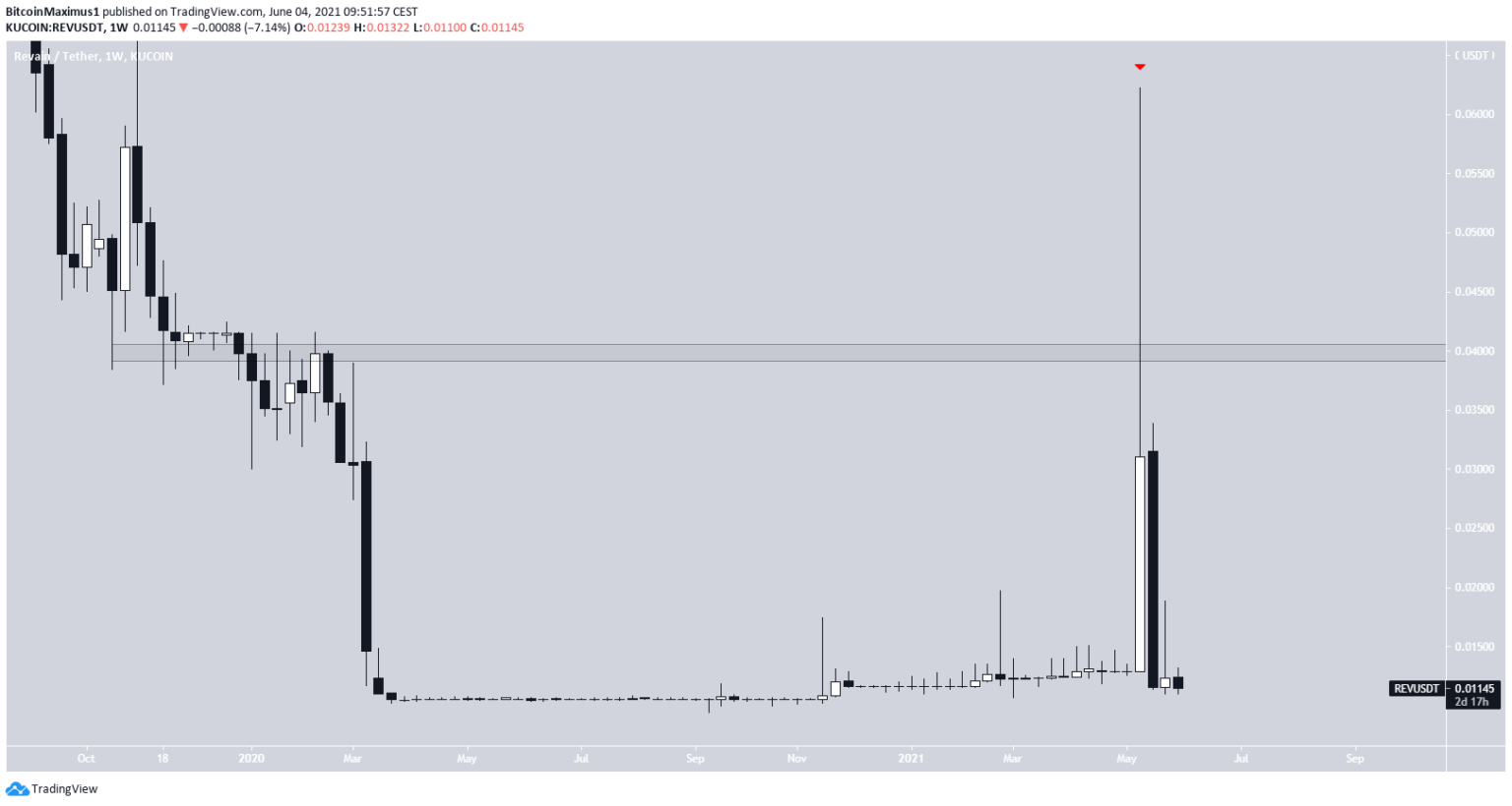 REV đã giảm kể từ khi bị từ chối bởi vùng kháng cự $0,04 vào ngày 11 tháng 5. Một cây nến với bóng trên rất dài đã được tạo ra.