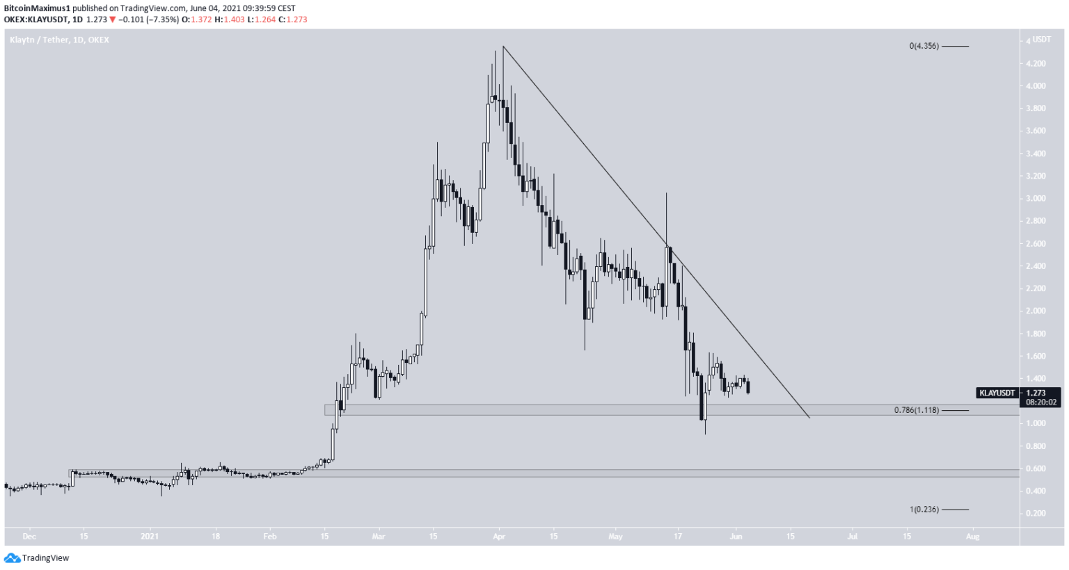 Vào ngày 24 tháng 5, KLAY chạm mức đáy thấp nhất ở $0,90 sau đó đã tăng trở lại. Sự bật tăng trở lại nà giúp xác nhận vùng $1,10 là hỗ trợ. Đây cũng là vùng giá trùng với mức hỗ trợ 0,786 Fib thoái lui.