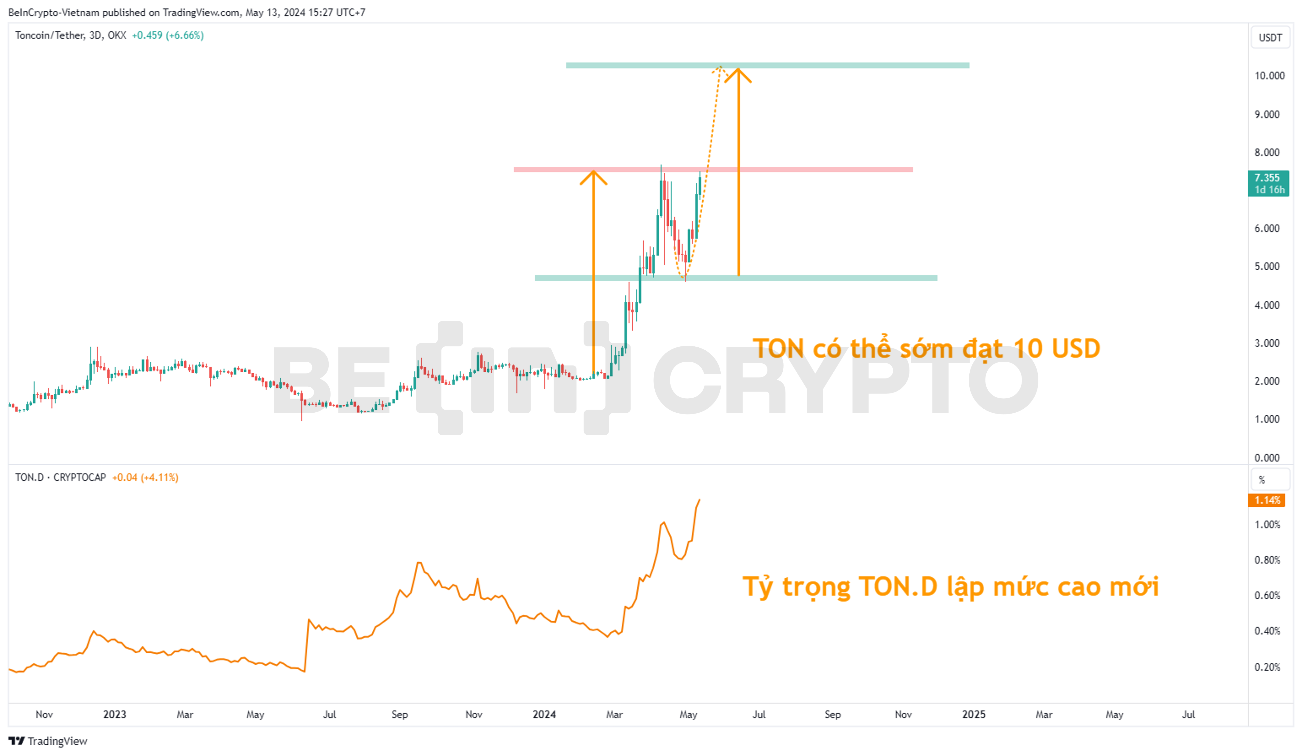- Tỷ trọng vốn hóa của TON đã tăng liên tục từ 0.2% hồi năm ngoái và đến nay đã vượt 1.1%. Tỷ trọng đã lập mức cao mới dự báo khả năng giá TON cũng sớm lập mức cao mới.